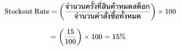 - จำนวนครั้งที่สินค้าหมดสต็อก = จำนวนครั้งที่ไม่สามารถจัดส่งสินค้าตามคำสั่งซื้อได้เนื่องจากไม่มีสินค้าในคลัง