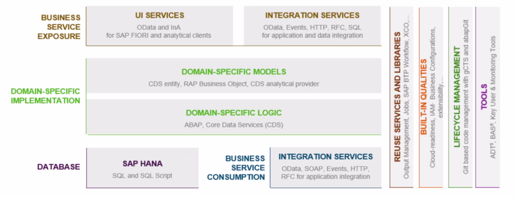 - Re-use services & Libraries: การนำบริการและไลบรารีกลับมาใช้ใหม่ กับบริการธุรกิจหลัก เช่น ช่วงของตัวเลข (Number Ranges), งานประจำของแอปพลิเคชัน (Application Jobs), ABAP ที่ผสานเข้ากับ SAP Fiori Launchpad และคลัง UI สำหรับการปรับใช้ SAPUI5 และ SAP Fiori Elements UI