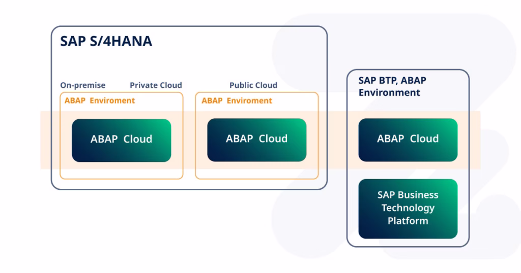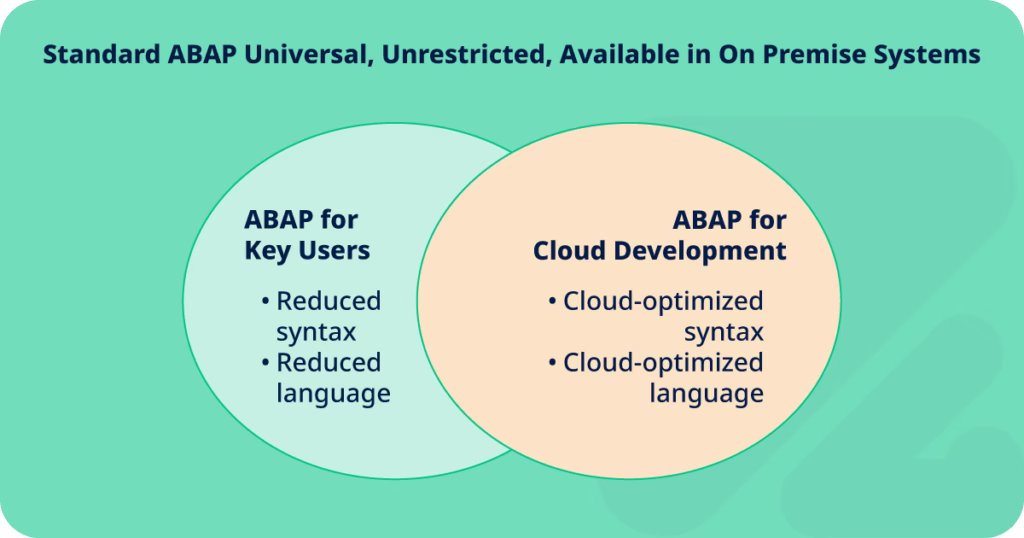 - ABAP for Cloud Development เป็นภาษา ABAP ที่ปรับสำหรับคลาวด์ เหมาะสำหรับการเขียนตรรกะทางธุรกิจ (business logic)