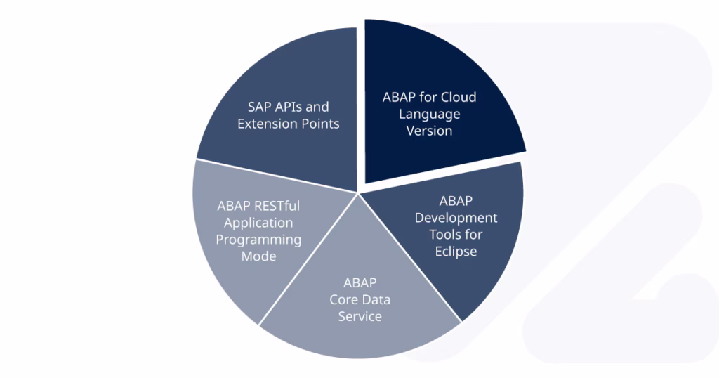 เวอร์ชันภาษา ABAP สำหรับการพัฒนาคลาวด์ (ABAP for Cloud Development) คือหัวใจสำคัญของ ABAP Cloud ตัวแกนเทคโนโลยีของ ABAP Cloud กำหนดสถาปัตยกรรมการออกแบบ (Design-Time) และรันไทม์ (Runtime) สำหรับส่วนเสริม (Extensions) บริการ (Services) และแอปพลิเคชันทั้งหมด องค์ประกอบหลักของ ABAP Cloud มีดังนี้